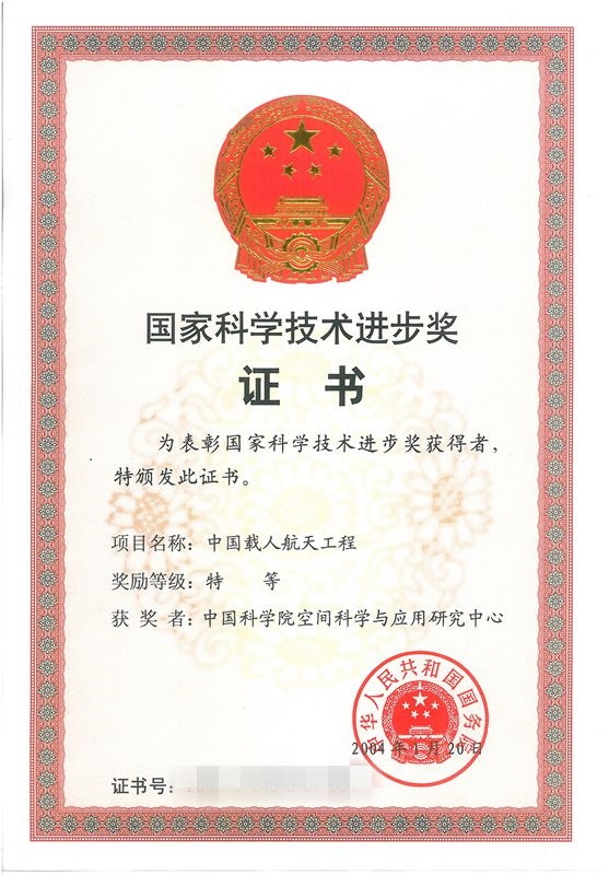 • 国家科学技术进步特等奖(2004.01)—中国载人航天工程