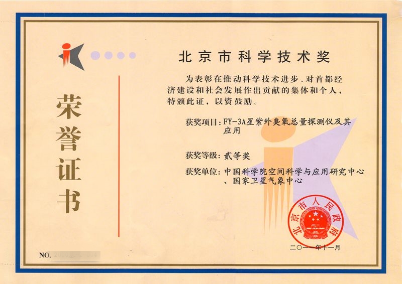 北京市科学技术二等奖(2011.11)—FY-3A星紫外臭氧总量探测仪及其应用