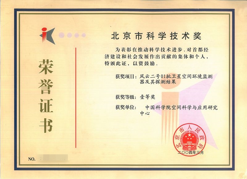 北京市科学技术一等奖(2004.03)—风云二号 01批空间环境监测器及其探测结果