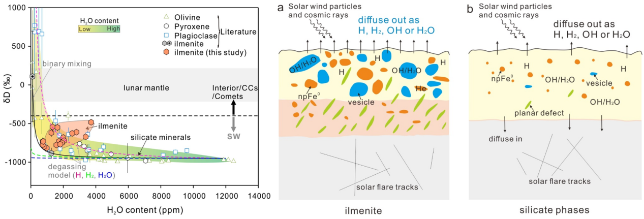 探明月表水的分布与储存机制,是理解月表物质演化、资源分布乃至未来利用的关键。遥感光谱观测与月壤样品分析均证实,太阳风注入的氢(H)是月表水的一个重要来源。近期遥感光谱研究显示,月表水含量的分布和动态变化可能与月表钛(Ti)含量相关:低钛区域的含水量通常高于高钛月海玄武岩区域,且高钛区域的OH/H2O表现出更为显著的日变化特征。然而,也有研究指出,在部分月海区域,水含量异常与钛含量并无直接关联。为揭示月球主要富钛矿物——钛铁矿在太阳风成因水形成与保存中的作用,空间中心太阳活动与空间天气重点实验室研究团队对嫦娥五号月壤中的钛铁矿颗粒表面风化层开展了水含量、H同位素组成以及微观结构分析。研究发现,钛铁矿表层保存的太阳风成因水显著低于硅酸盐矿物。首次阐明了钛铁矿影响月表水演化的两个关键机制:一方面显著促进太阳风成因水的生成;另一方面却难以维持该水的长期稳定保存。这一发现为解释月球不同钛含量区域月表水含量的差异分布提供了直接的矿物学证据,也为未来以钛铁矿为主要对象的月球原位资源开发利用提供了重要科学依据。相关成果发表于《Nature Communications》。