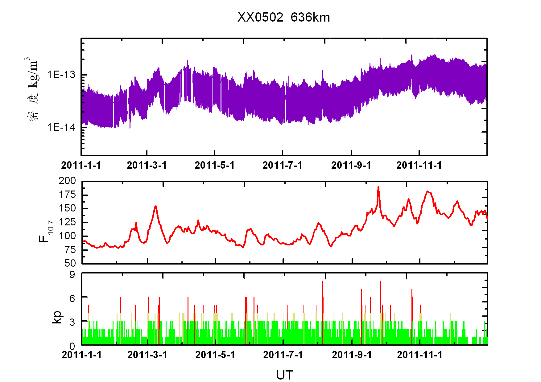 太阳活动程度不同,改变了太阳辐射强度,尤其是远紫外辐射变化会引起大气密度的显著变化。如图3.5所示,地磁活动相对宁静期间,实测大气密度与太阳活动程度呈现出正相关关系,不仅轨道大气密度随F10.7增加而显著增高,轨道图上日照区与阴影区之间原子氧数密度的变化幅度也相应加大。
