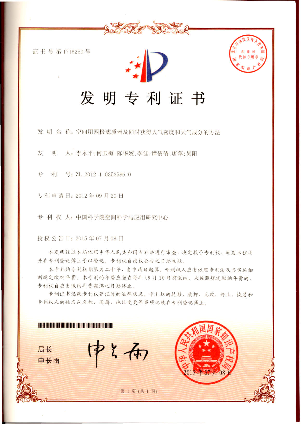 (2015.07)一空间用四极滤质器及同时获得大气密度和大气成分的方法