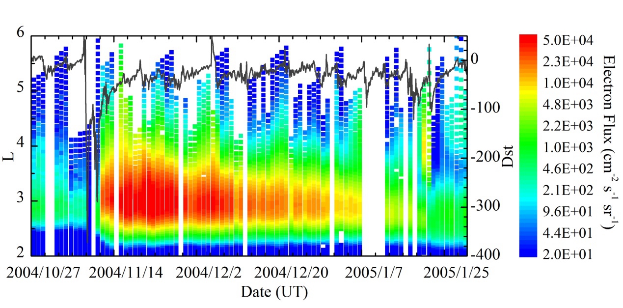近日,空间中心杨晓超等人,利用风云一号卫星空间环境监测器(空间环境探测室自主研制)获得的探测数据,结合国外数据及数值计算结果,发现并证明本地加速机制可以在地球辐射带“槽区”有效激发相对论电子增长,而且增长后的高通量水平可维持近两个月,使得原来较为安全的“槽区”成为内部充放电风险极高的区域。该结果发表于American Geophysical Union(AGU)学术期刊《Journal of Geophysical Research: Space Physics》。