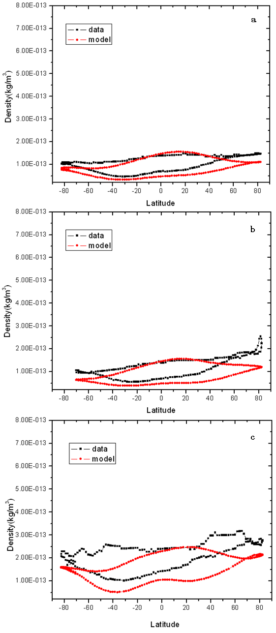 图4-c 为UT2005/09/11/05:02期间大气密度探测值与模式值变化比较,图上不仅明显可见整个轨道圈(全球)所测大气密度值迅速上涨,而且在南北半球高纬地区(尤其是N40~N70)也同时出现了强烈的异常上涨现象,大气密度探测值最高已达3.25×10-13 kg/m3,与磁扰前大气密度比较,增变比达2.32倍。而此时模式值在南北半球高纬地区虽也出现上涨现象,但无明显的扰动现象出现,最高值由事件前1.52×10-13 kg/m3,上升到2.25×10-13 kg/m3,增变比仅为1.48,比实测值增变幅度小得多。