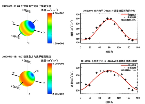 图:天宫一号带电粒子辐射探测器实测高能电子和质子方向分布;左侧的彩色球体表示天宫一号在南大西洋异常区中心不同方向上的电子和质子的辐射强度,右侧图表示在南大西洋异常区中心电子和质子通量随投掷角的分布。