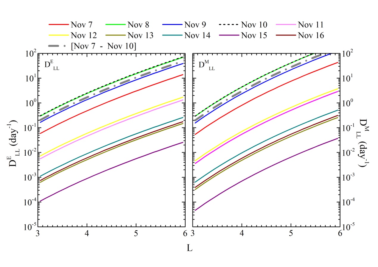 文章还用径向扩散加速效率以及哨声模和声波共振加速效率数值计算的结果证明,哨声模和声波与能量电子相互作用是导致这次“槽区”相对论电子增长的主要机制。结合通量衰减时间特性的分析和hiss共振损失效率的数值计算结果,该研究成果认为相对论电子与等离子体层顶内hiss和EMIC波动共振导致的缓慢损失,是该区域相对论电子能够长时间存在的原因。
