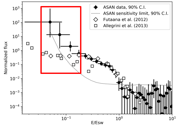 最新的研究发现,月面能量低于0.1Esw(Esw为入射太阳风离子能量)的中性原子通量明显高于以往遥感观测结果,这一发现使科学家距离揭示太阳风与月表相互作用的规律更进一步。该发现是基于嫦娥四号中性原子探测仪(ASAN)的探测数据,也是人类首次在月表开展中性原子参数的就位探测。