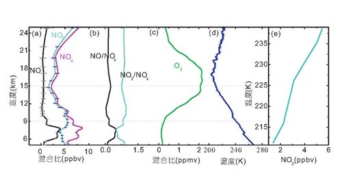 图:高空气球的观测结果. (a)大气NO,NO2,NOx的混合比随高度的变化 (b)大气NO和NO2在NOx中的占比 (c) 臭氧随高度的变化 (d) 高空气球轨迹上温度随高度的变化(e) 9~15公里大气NO2和温度变化的相关性曲线